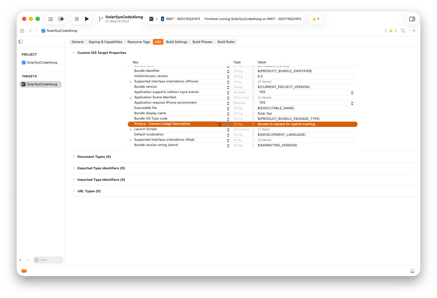 Your app will access camera for 3D spatial tracking. This allows you to place 3D virtual objects in your room and you can walk around and inspecting them. Very cool! Apple asks that you must inform this to the users and get their permission first.