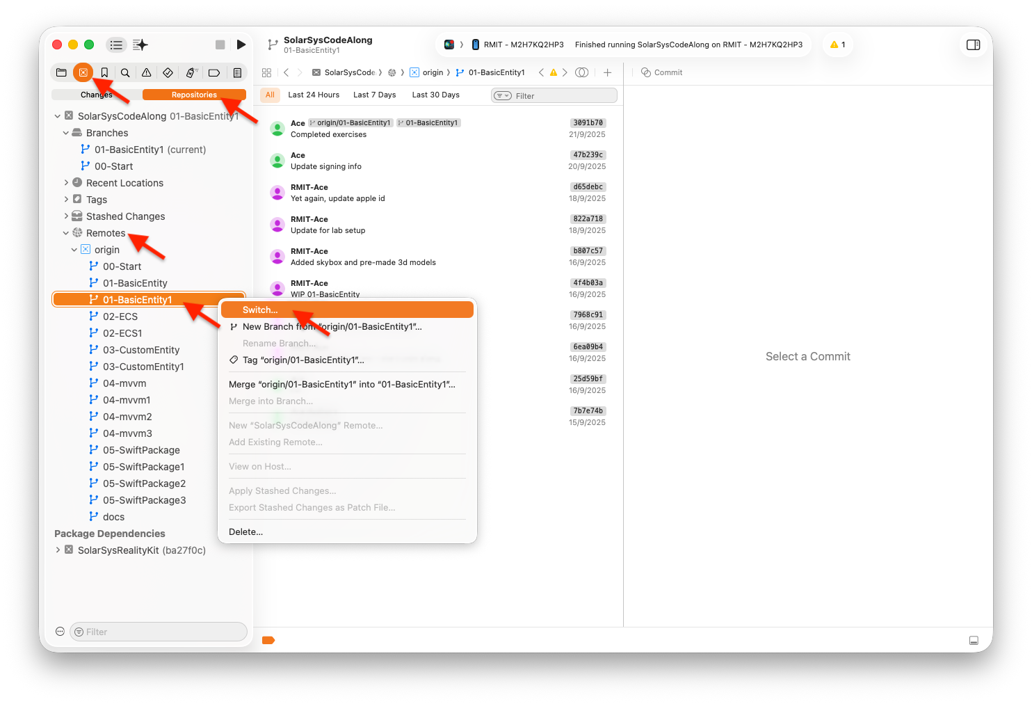 This code-along comes with many exercises. Each exercise has a starting point, and its next milestone steps - each in its own ‘branch’. For example, for our first exercise, 01-BasicEntity, you will see a branch ‘01-BasicEntity’, then, ‘01-BasicEntity1’ and so on.